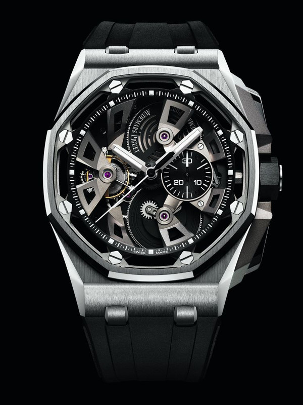 Now, onto the more dramatic anniversary piece, a new Royal Oak Offshore Tourbillon Chronograph, also limited to fifty pieces each in 42mm of stainless steel or rose gold.
