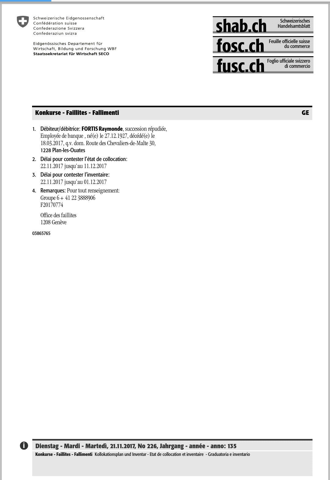 The Swiss Official Gazette of Commerce (SOGC) website lists documents dated 21 November 2017, 23 November 2017 and 24 November 2017 showing that the Civil Court of Soleure-Lebern has granted Fortis debt deferral in the form of a collocation plan and six months for debt cancellation, ending on May 20, 2018.