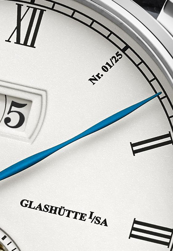 There are a number of differences between this and the standard Senator Tourbillon. The first is the dial. It is varnished silver-grained instead of matte black, with black laser engraved indices and a railroad chapter ring. The second is an unusual interesting touch; in place of a Roman numeral at one o’clock there is “No. X/ 25” styled to look as such. Finally, there are blued hands instead of the rhodium-plated ones on the original.