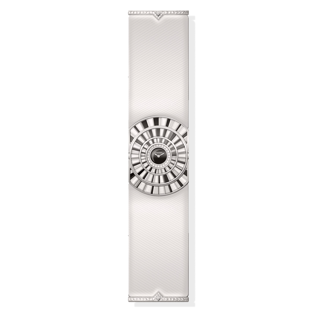 The new Baignoire Infinie’s ‘base’ which is its inspiration is the Baignoire Allongée. A white gold case surrounds a dial with baguette-cut diamonds, white mother of pearl, Tahitian mother of pearl, and black spinels. This will be in a numbered limited edition of twenty pieces.