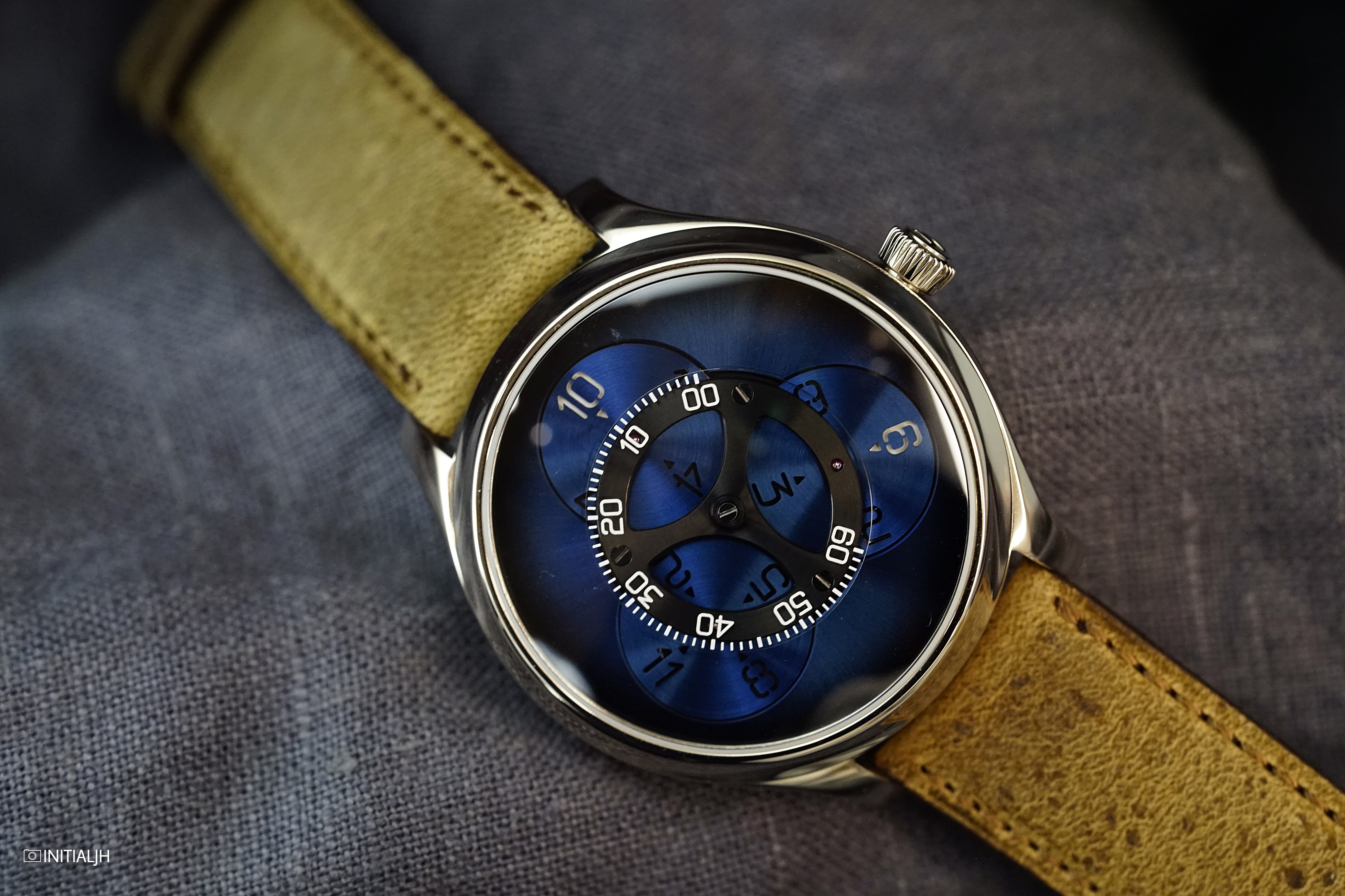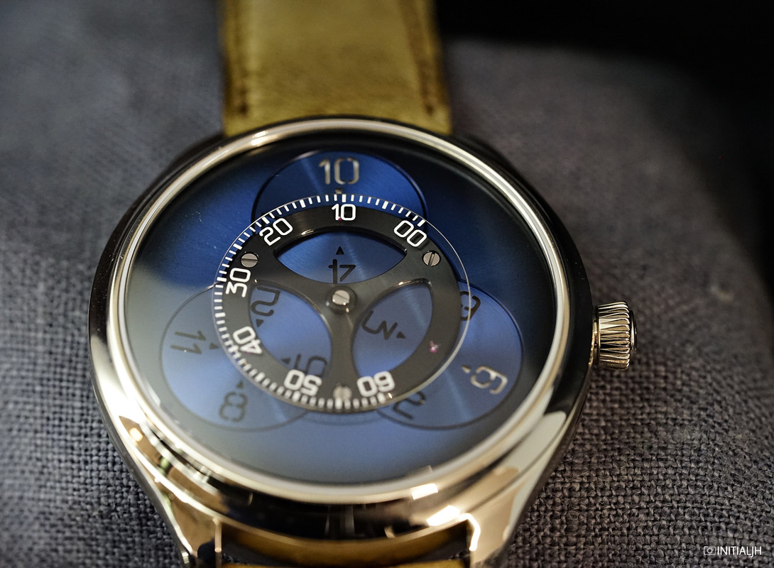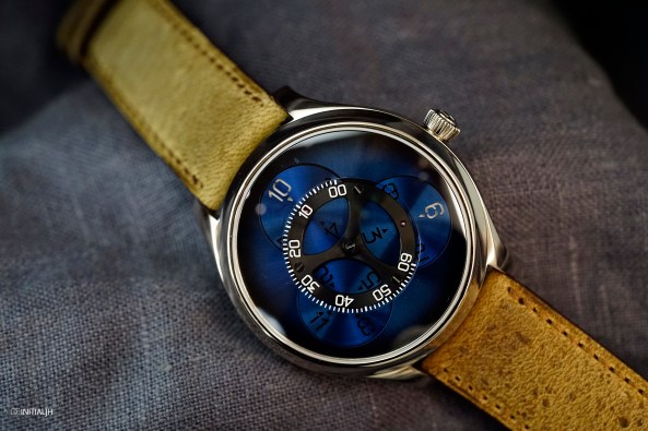 A wandering hours display powered by a new in-house movement with a Funky Blue fume dial. Such is the Endeavour Flying Hours, the first watch from H. Moser & Cie to show the time using a satellite system of discs, and which we had the opportunity to see at the SIHH 2018.