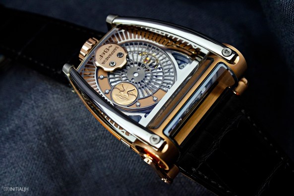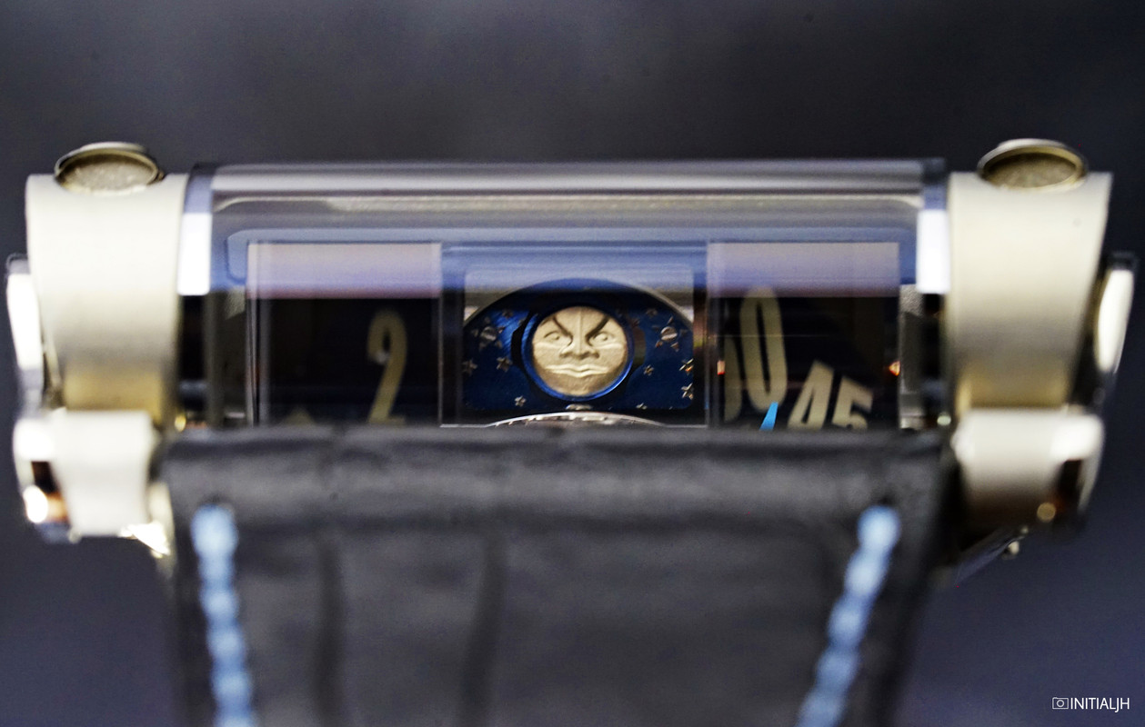 His other style of moon for which he is known lies with the hours and minutes, all of which are projected via an optical prism that refracts the flat hours, minutes, and moon (actually two moons mounted on a disc) to appear as if they are perpendicular to the engine.
