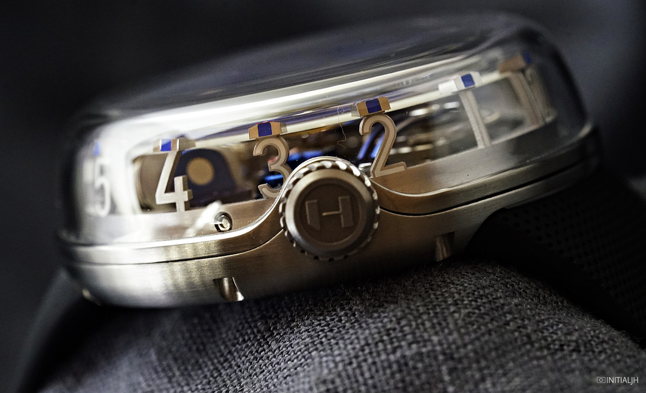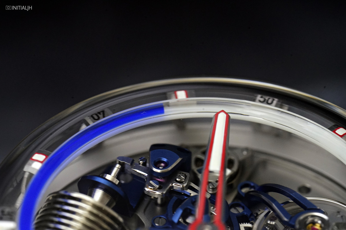 The ‘hyrdomechanical horology’ system, in which a pair of bellows propels a coloured fluid through a capillary to indicate the minutes, has hours indicated via a central jumping hand. Something of particular note about the H²O is the design of the ‘floating’ hour numerals and markers, which are visible from the side because of the shape of the crystal.