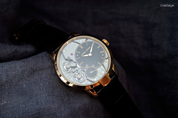 The Calibre ARF15 used in the earlier watch was redesigned so that the time displays receive energy from the lower regulator, whilst the upper regulator creates resonance. The regulators take pride of place. As well, the flyback mechanism of the ARF15 was removed and replaced with a small seconds sub dial.