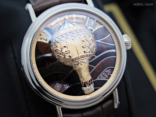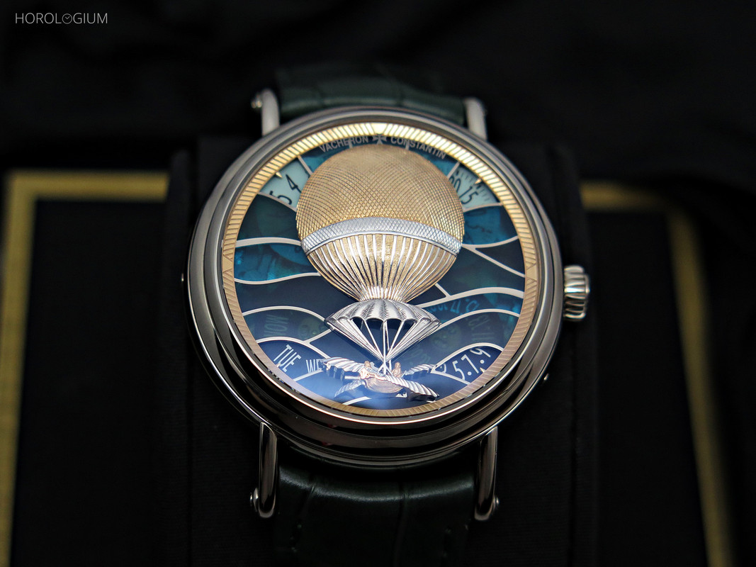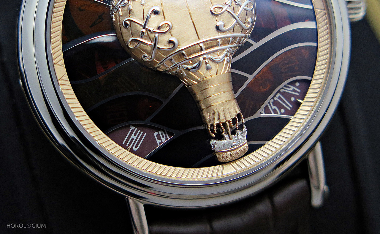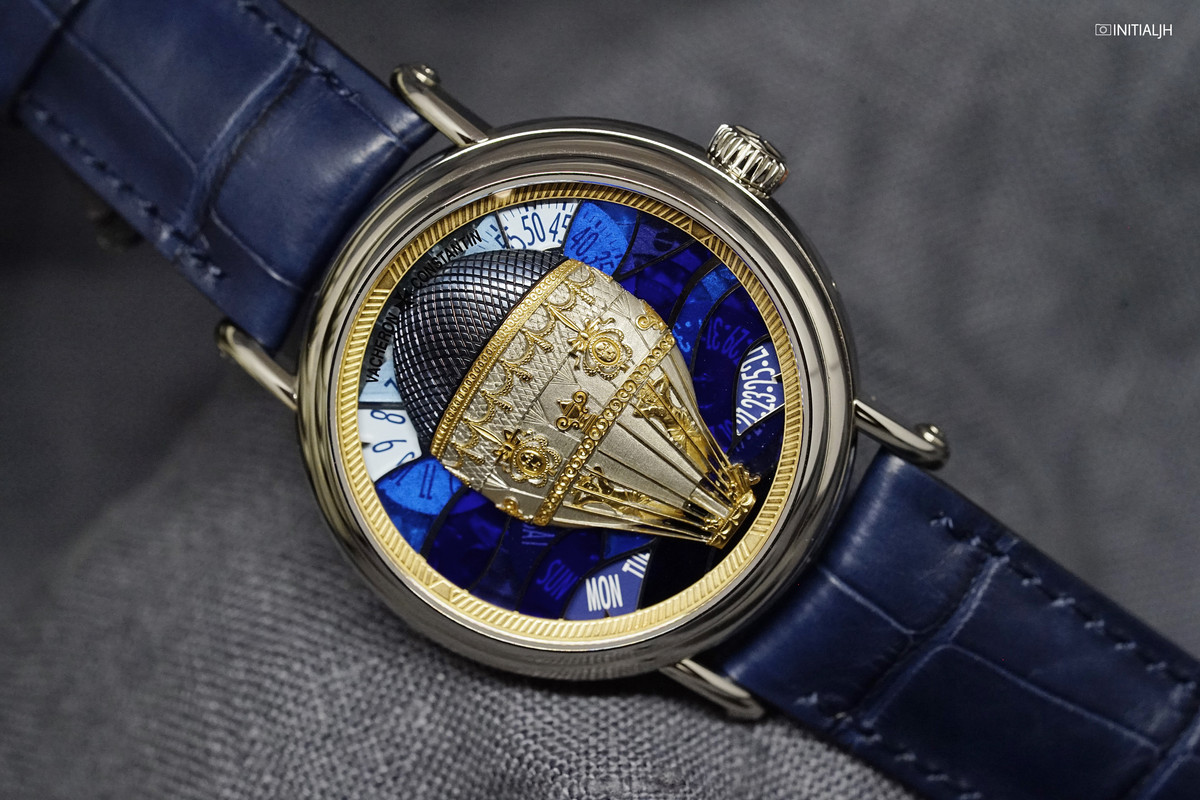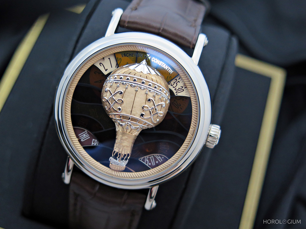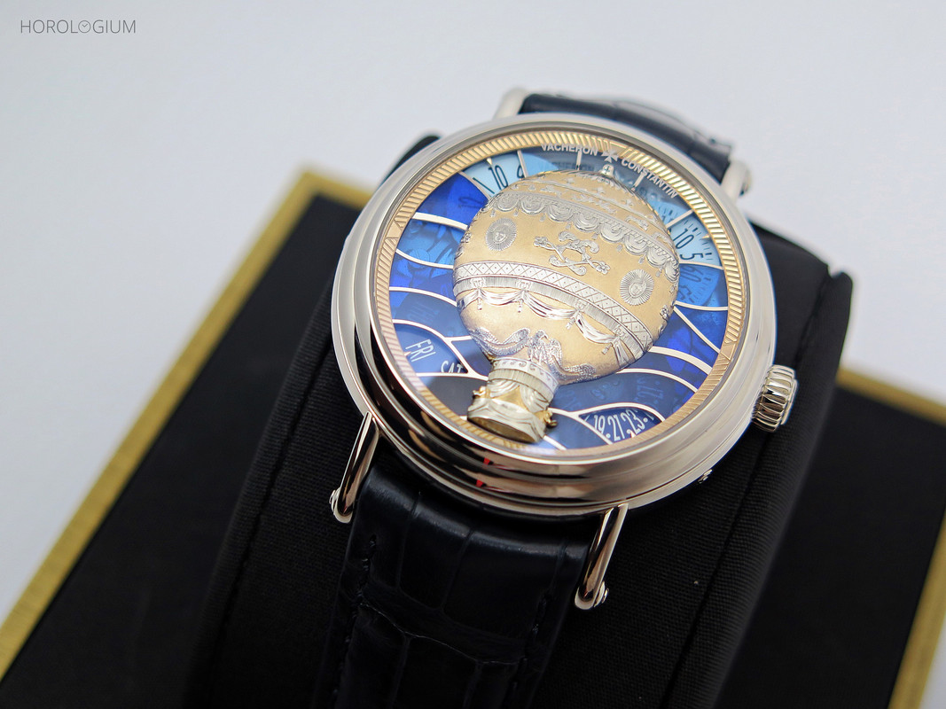 With its various shades of translucent blue enamel and the white and yellow gold engraved balloon, it is notable for blue-tinted upper sector, created through a gold electroplating process.