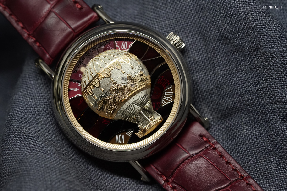 Next up is the ‘Bordeaux 1784’, in an apt colour scheme. Vacheron have stated that this is inspired by a three person flight that took place in this region in that year, but Bordeaux was a popular ballooning experimentation location. Jean-Pierre Blanchard flew from there that year, a couple of people had failed attempts, and three gentlemen named Antoine Darbelet (a lawyer), Jean Chalifourt (an architect) and Jean-Baptiste-Alexandre Désgranges (a merchant) managed two successful flights with self-built balloons in the style of Montgolfier ones. The balloon on the watch is, again, highly decorated in its engraving, including mythological references.