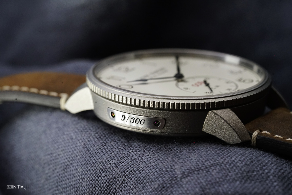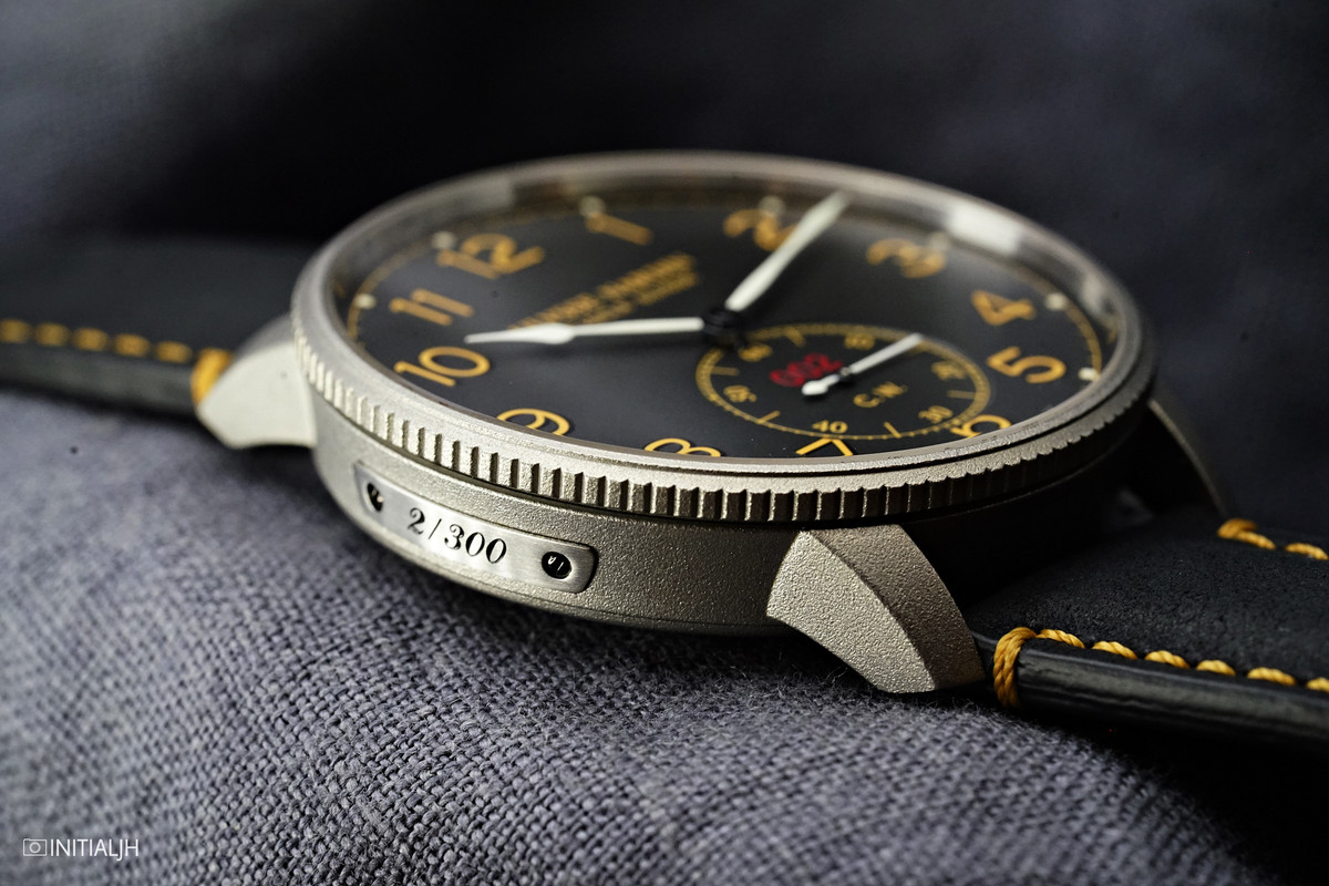 The extremely legible dial features large Arabic numerals, with a slightly recessed snailed sub dial that is characterised by two features of particular note; the initials “C.W.” to indicate that it is a ‘chronometer watch’, and a red number that shows the watch’s serial number out of the limited edition of 300. The placement of this number in such a large fashion on the dial is very unconventional . There is also the Classic Ulysse Nardin plaque on the side of the case, with the limitation number.