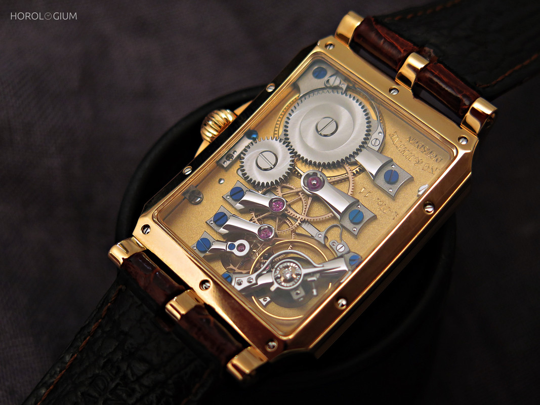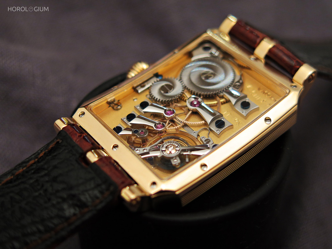 The back is where the Georg distinguishes itself from other watches, with the unusual and intriguing architecture of the new hand-wound Calibre VIII, with its case-matching rectangular-shaped base plate. It beats at 18,000VPH, and has a power reserve of 55 hours. It looks stripped back, with every detail starkly visible, including the finely finished golden wheels, the unusual steel bridges, the large polished stone countersinks. It has four steel cocks replacing bridges, holding the wheels of the gear train in place, with the balance and barrel having similarly shaped steel bridges. This is a movement that says, firmly but not stridently, ‘look at me’. It is anything but ordinary.