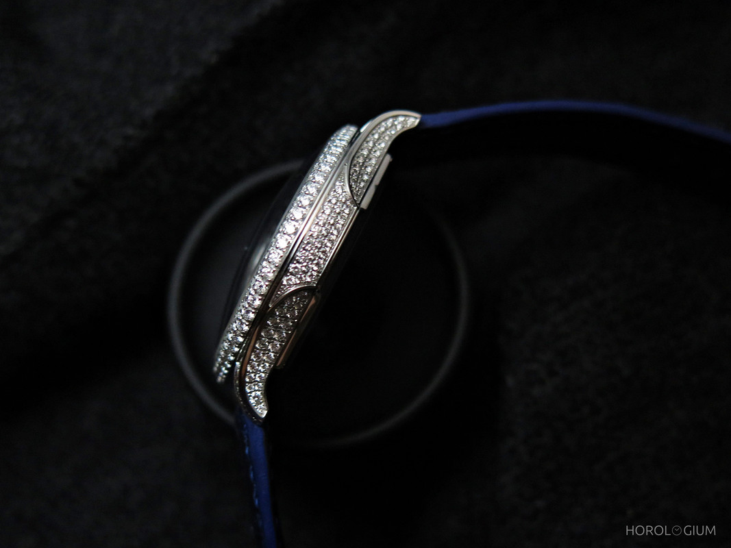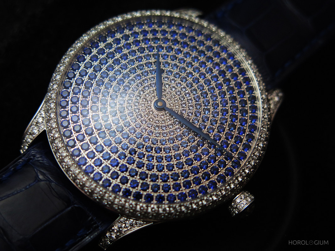 At the event I spent a total of almost half an hour with this watch, including some time with it strapped to my wrist. The environment was dimly lit, which allowed the dial to have flashes of sparkle as it caught the light, but it also meant that its ‘blueness’ and the effect of the colour gradation was best viewed/ appreciated with extra lighting (and a loupe). I mention this for those who might feel inclined to own such a piece and wear it in the evening. If you are looking for a watch with a single stone/ colour jewelled dial but with a difference, then this may be something for you to consider.