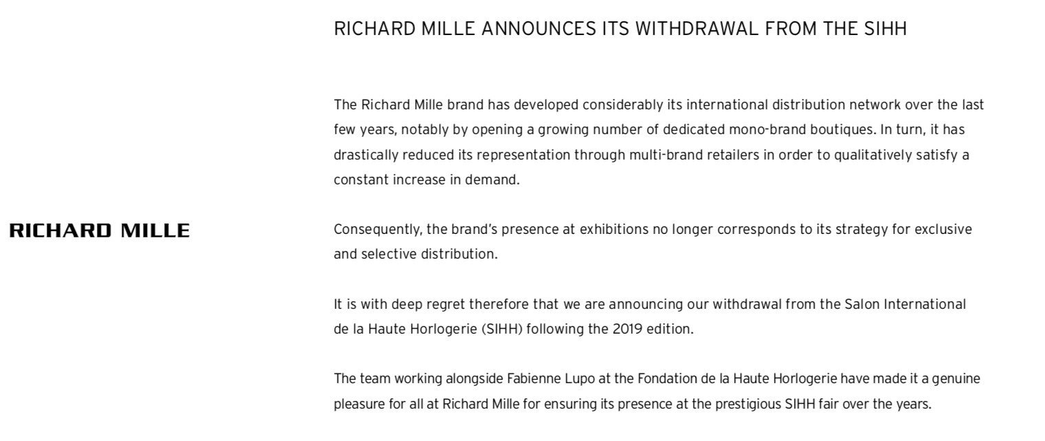 Richard Mille issued a statement, which you can read below, outlining their reasons. The brand first joined the SIHH in 2010.
