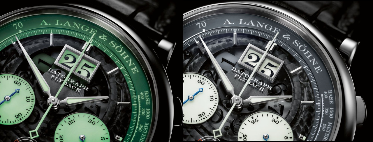 This is achieved through the use of the now familiar semi-transparent dial, with a luminous compound that gives the displays the same distinctive green ‘Lumen’ glow, in the dark. The rhodiumed gold hour and minute hands are filled with the luminous material, whereas the rhodiumed steel chronograph sweep seconds hand is fully coated with the compound. The seconds hand and minute counter in blued steel revolve above night-illuminated subsidiary dials. The outer ring is in polished German silver, and the inner ring is coated in sapphire crystal. The tachymeter scale is also luminous, as is the out-sized date and the power reserve indicator.