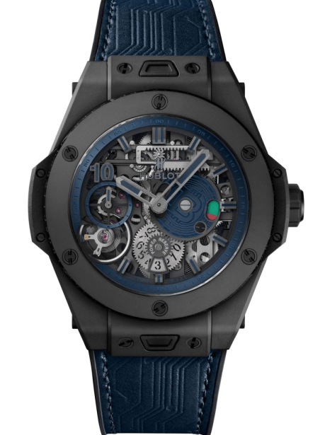 Powering this new watch is the Hublot Calibre HUB1201, with a ten day power reserve. This movement was chosen because of it being a ten year commemorative piece. Covering the movement on the case back is a sapphire case back decorated with what is meant to be a signifier of electronic networks.
