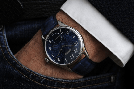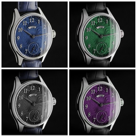 ‘Gelidus’ means cold or frosty in Latin, and the new piece is, as the name indicates, a variant of Laine’s Gelidus model, which has frosted finishing on both the dial and movement sides, only this time, with hand engine-turned moiré pattern guilloché work on the dial. Available in a number of dial colour options, the applied indices are rhodiumed steel, and all hands are steel. For those who aren’t as keen on nameplates, the watch is also available without it, but with the name text in white print instead.