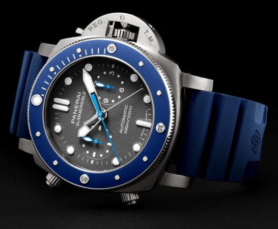 The new Submersible Chrono Guillaume Néry edition is the classic 47mm Sub case, in brushed titanium. The two chronograph pushers of the name are on the left of the case. With a water resistance of 300m (30 bar), the unidirectional diving bezel is also titanium, and has a very attractive dark blue ceramic scratch resistant insert. The blue theme continues, with the new PAM00982 coming on a dark blue rubber strap.