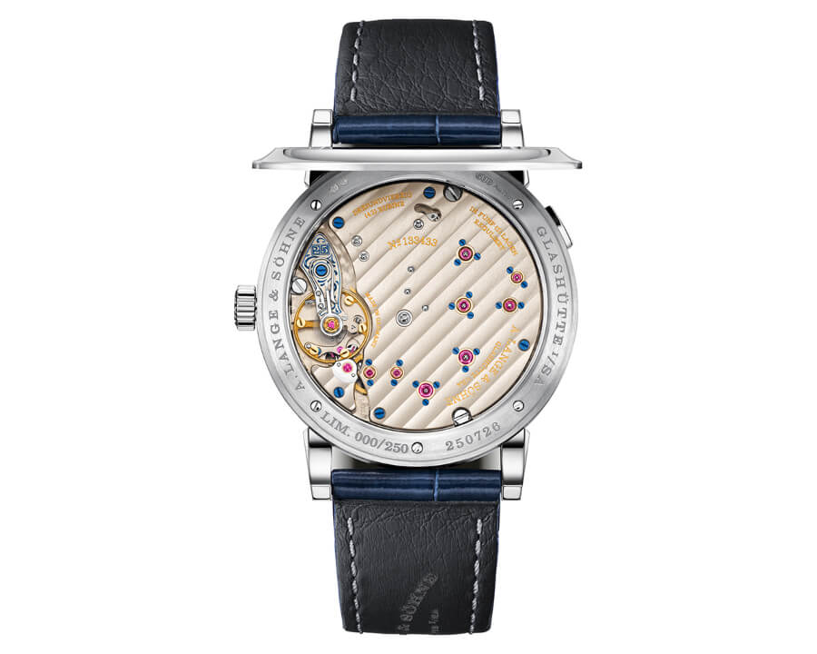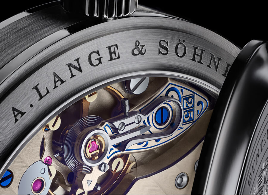 The case is 38.5mm x 10.7mm, but what is of particular note is that it has a white gold hinged cover (sometimes also called an ‘officer’s case’. A ‘hunter case’ pocket watch, on a similar vein, is a case with cover, that closes over the watch-dial and crystal, protecting them from dust or damage) with an engraving of Lange HQ, the names of Walter Lange and Günter Blümlein, and a relief engraving of the inscription “25 YEARS LANGE 1”.