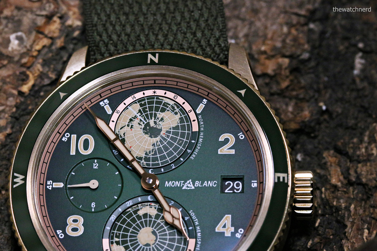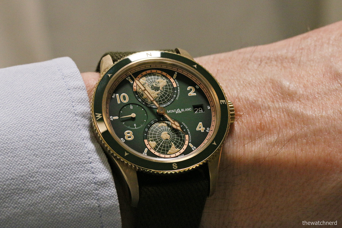 The 42mm case, water resistant to 100m, has a bi-directional bronze bezel with green ceramic insert marked with the four main compass points. The khaki-green dial features beige Arabic numerals, red gold-coated cathedral-shaped hour and minute hands, beige time zone hand, and a vintage Montblanc logo at 3 o’clock.