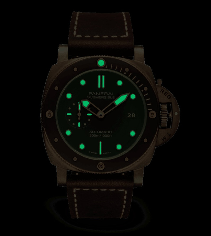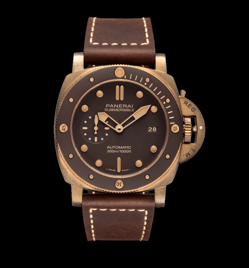 The new Submersible Bronzo PAM00968 is most notably distinguished from its forebears by being the first Bronzo to feature a ceramic bezel in its 47mm case. The micro-sandblasted ceramic is brown, matching the dial’s colour. There is a date window at 3 o’clock, sub seconds at 9 o’clock, and the hour markers and dots are lumed.