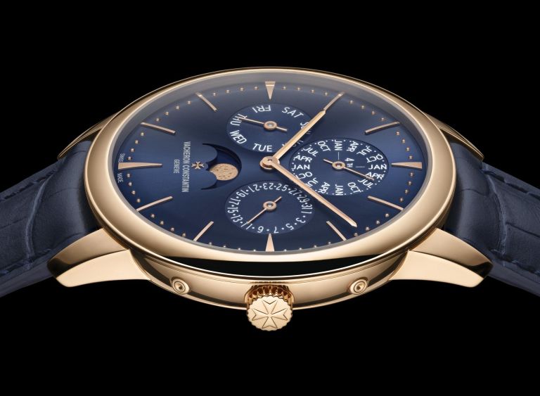 The blue dial extravaganza of 2019 continues, with Vacheron Constantin’s introduction of a new perpetual calendar ultra thin in pink gold with a dark blue dial. It joins the Midnight Blue Patrimony models, blue Overseas and ‘Petrol Blue’ FiftySix pieces introduced at the SIHH 2019.