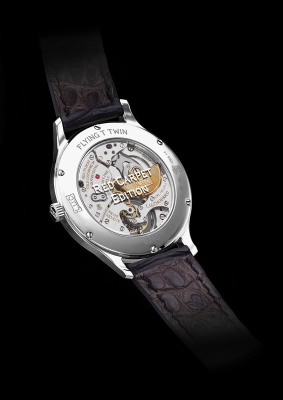 In a limited edition of just ten pieces, it comes on a matte black alligator strap with brown alligator lining and a 950 Pt pin buckle.