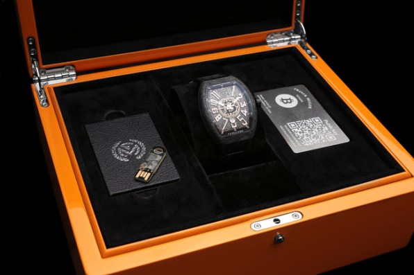 Each timepiece comes as a two piece ‘Deep Cold Storage’ set, so along with the etched public address you get a a sealed USB containing the private key. This USB is blank and used to generate the offline wallet via non-deterministic TRNGs (True Random Numbers Generated).