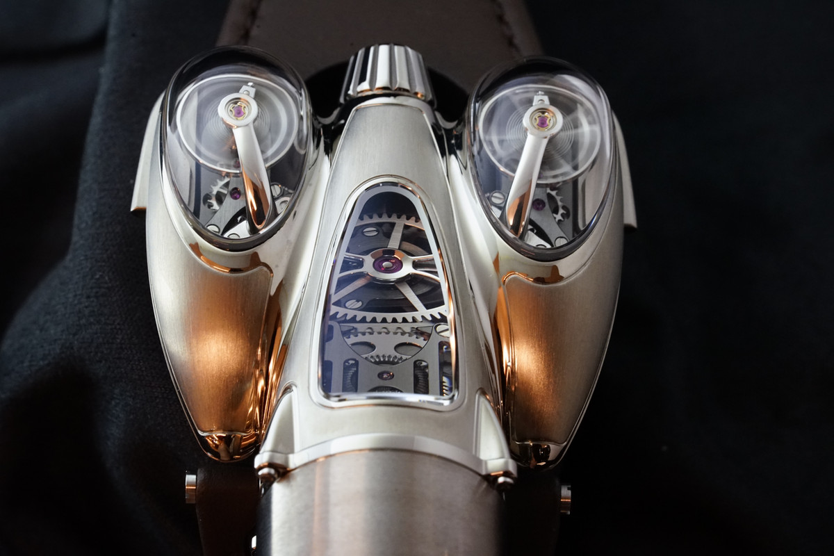 Unlike the HM4, the titanium Flow is pure curves, with a tapered conical centre wherein the hours and minutes are read from a gauge-style dial on the side of the watch, and two cones on either side. Each of these cones contains an independently beating balance wheel (each beating at 18,00VPH), visible through two of the watch’s five sapphire crystal topped openings. Their rate is balanced (averaged) out by a planetary differential that is located in the central body of the watch that averages out the two balance wheels, and is displayed at the front.