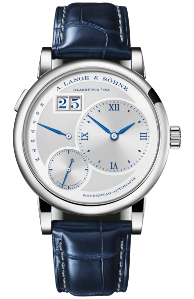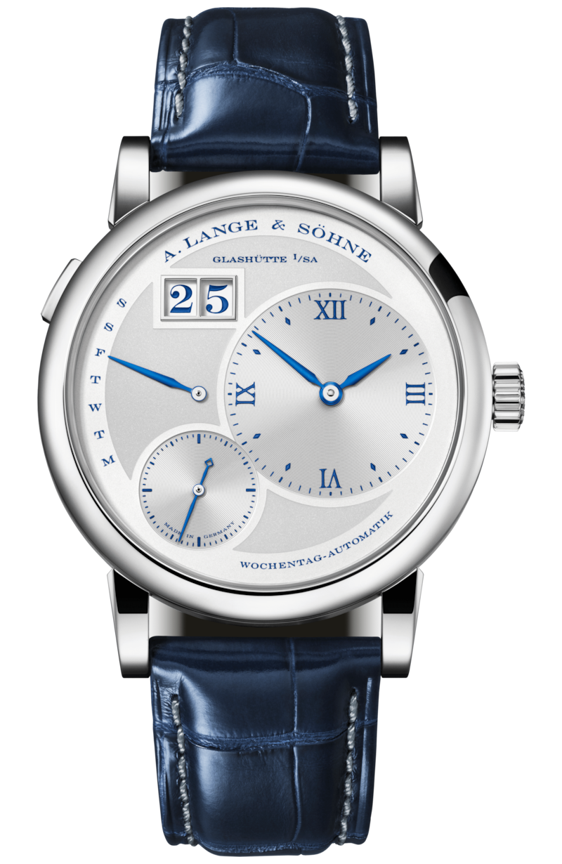 Earlier this year we mentioned A. Lange & Söhne’s Lange 1 25th Anniversary, the first in a series of limited edition ‘birthday watches’ released in 2019 which have several features in common – an argenté-coloured dial in solid silver with printed deep-blue numerals and hour markers, blue date numerals, and a blue alligator leather strap with a grey seam.