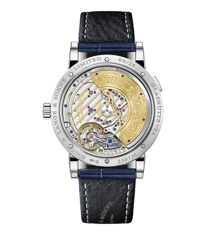 This new 25th Anniversary model for 2019 comes in the same sized case, this time in white gold. Inside is the same automatic in-house Calibre L021.1, which beats at 21,600VPH and has a power reserve of 50 hours. It has the familiar A. Lange & Söhne decoration, with an engraved gold (platinum mass) rotor, Glashütte ribbing and perlage and, like in the Anniversary manual pieces, the balance cock of the cal. L021.1 has a hand-engraved, blue-filled floral pattern with a ’25’ in the same typeface as the Lange outsized date.