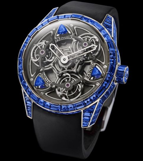 So now to today’s watch, which they have given a radically different moniker. With he same AFP-TTR-3X movement as the others, the pièce unique TTR3 Blue Equalizer Frequencies comes in a 47mm sized 18 carat white gold case set with 233 baguette-cut royal blue sapphires totalling over 24 carats in total, with three sapphires on the dial between the three tourbillons. The crown alone is set with 20 sapphires.