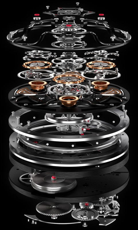 The position and closeness of the three independent tourbillons enables them to synchronise to an identical frequency through what is known as ‘resonance’, thus forming one regulator, so to speak, beating at 21,600VPH. To read about resonance, go to either this link or this one, to read about a couple of other watches which have utilised this phenomenon.