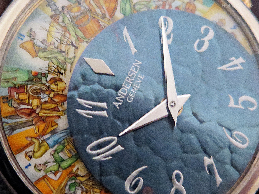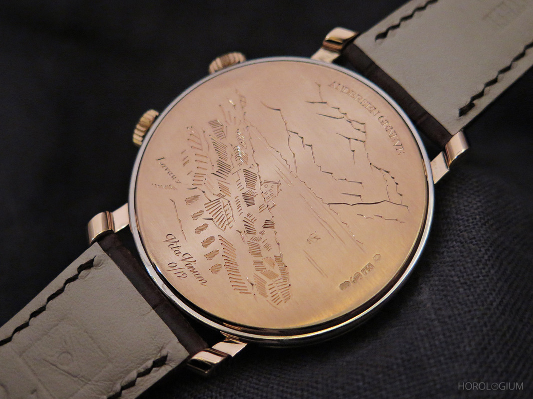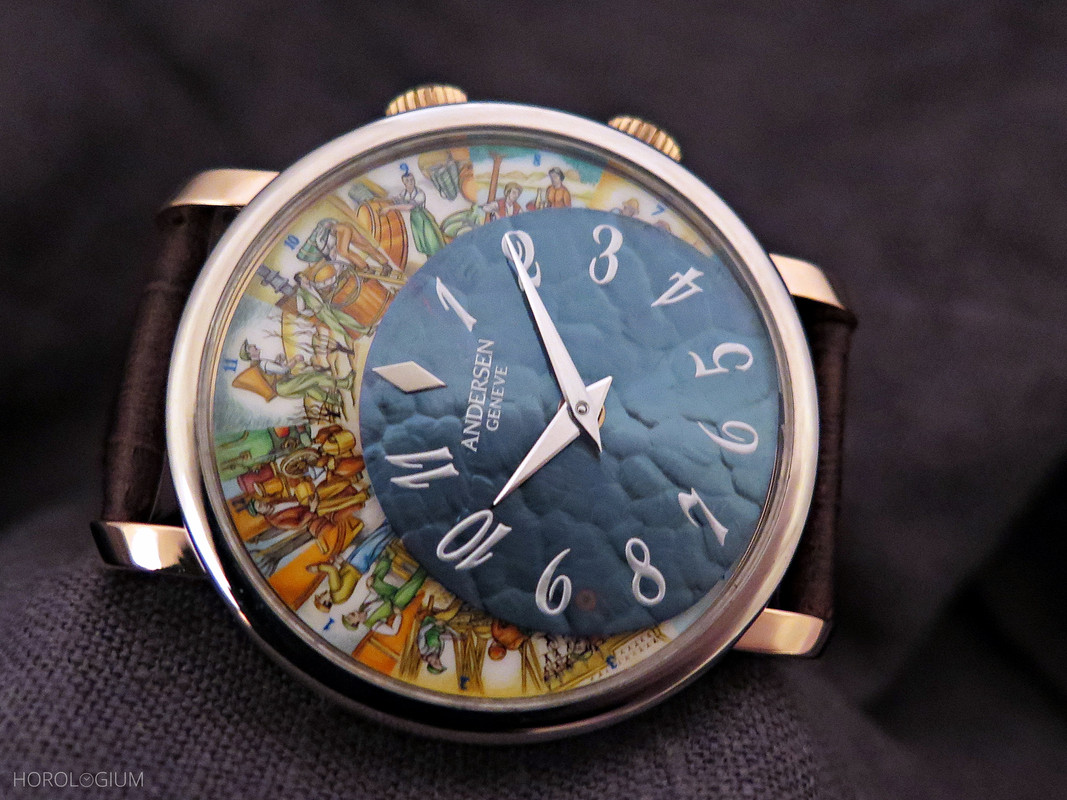 Inside is an automatic movement to which Andersen has added an in-house developed module that moves the decorated disc once every 24 hours. It beats at 21,600VPH and has a power reserve of 36 hours.
