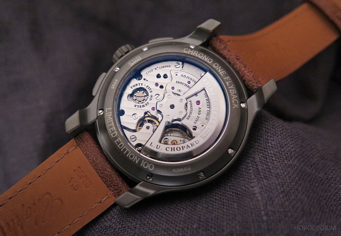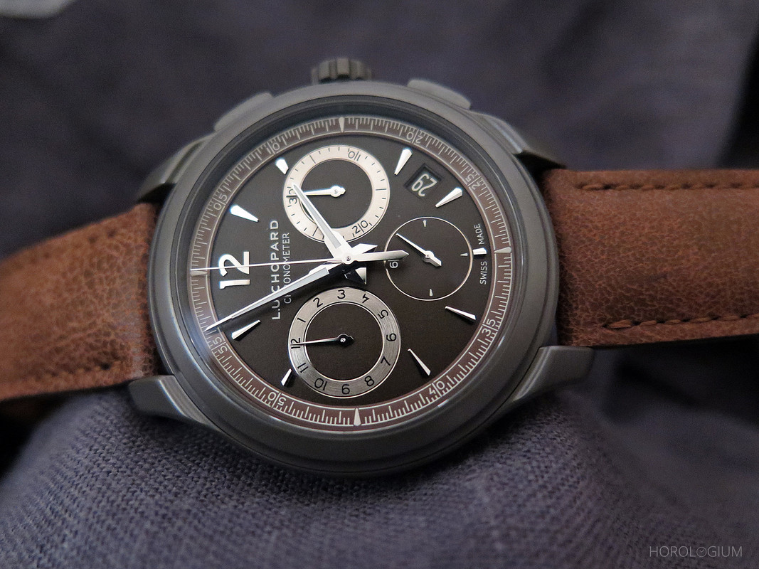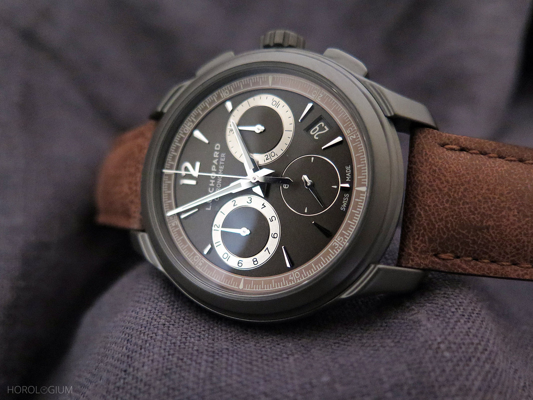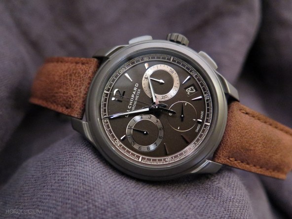 Strapwise it’s brown calfskin with brown calfskin leather lining, and a polished Titalyt® folding clasp. To wear it’s light and comfortable, and I like the look and feel of Titalyt®. This is probably one for L.U.C. fans who are looking for a sporty chrono that they won’t have to worry much about scratching, and who like knowing that there’s a tried and tested movement inside.