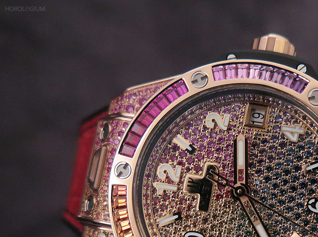 The 99mm Big Bang case is in satin-brushed and polished 18 carat King Gold, with 473 colour gemstones, of which 48 baguette-cut ones are on the bezel and 307 on the dial. There are eight types of stones : rubies, pink sapphires, amethysts, blue sapphires, blue topazes, tsavorites, yellow sapphires, and orange sapphires.