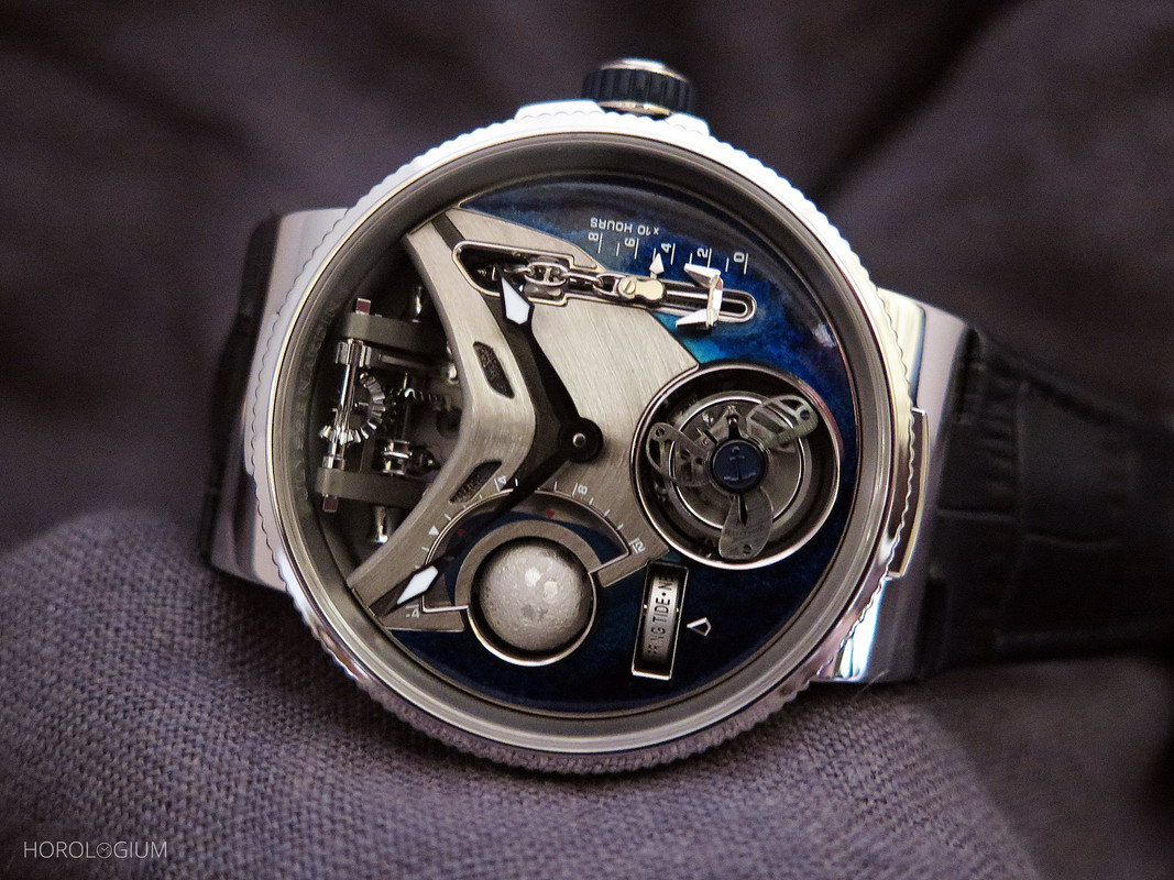 A follow-up of the Marine Grand Deck Tourbillon of 2016, this platinum-cased watch features a grand feu enamel dial (to represent the sea), a one-minute flying tourbillon at 6 o’clock complete with propeller decoration, linked moon phase and tide indicators, and an anchor themed power reserve indicator.