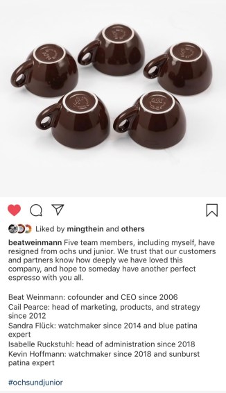 In a post on his Instagram account, ochs und junior CEO Beat Weinmann announced his departure and that of four others from the brand he co-founded in 2006 with Kurt König and Ludwig Oechslin.