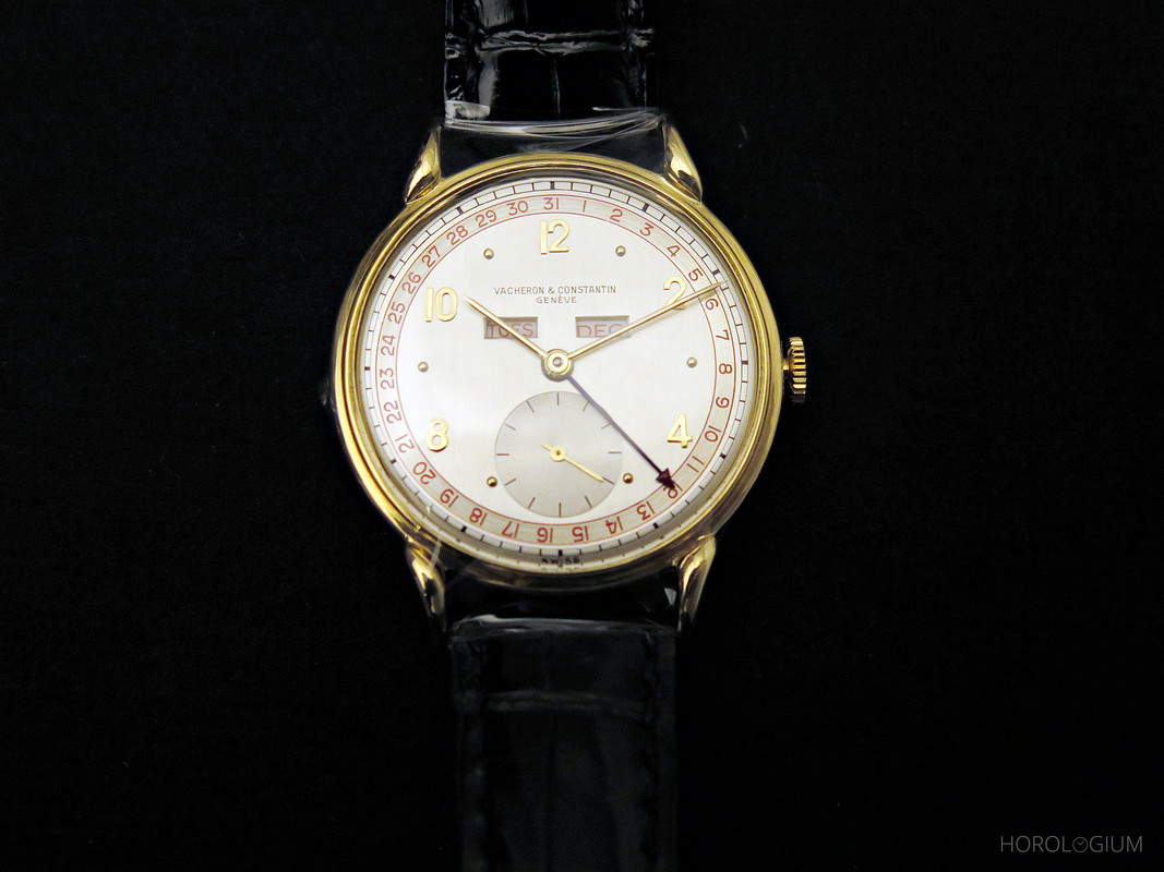 The third watch is a 1945 Ref. 4240 Complete Calendar in 18k yellow gold and perhaps the one that is most familiar to people as being the inspiration for the Historiques Triple calendrier 1942. It has a two tone silvered dial with yellow gold Arabic numerals at 2,4, 8, 10 and 12 o’clock, and six cabochon markers in yellow gold between them. The day and month indications are in English, and the date ring with red Arabic numerals is accompanied by a date hand is blued steel with a red lacquered arrow tip. Next to this is a rail road track for the minutes. There is also a small seconds at 6 o’clock.