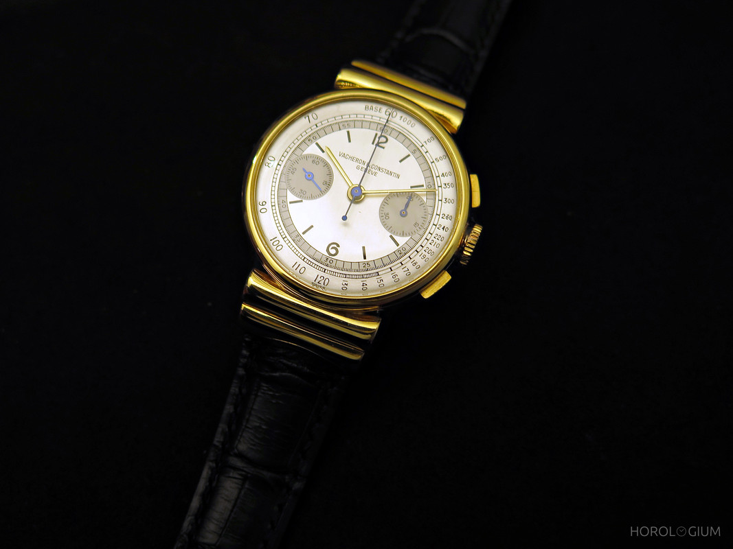 The second piece is a chronograph. Originally sold in Turin in 1940 and part of Vacheron Constantin’s ‘Quarter Millenium’ Geneva sale on April 3,2005, this 18k yellow gold Ref. 4083 dates back to 1940. In a 32.5mm sized case with double scroll lugs soldered to the case (interesting lugs being a feature of vintage Vacheron watches), it has a classical look – a two-toned silvered dial with black lacquered Arabic numerals, baton indices, minute track, tachymetre, a 45-minute counter for the chronograph function, blued chronograph hands and yellow baton hour and minute hands. Inside is the manual-wind Calibre 295 with twenty jewels and a Swiss lever escapement. This one will set you back AUD 95,000.