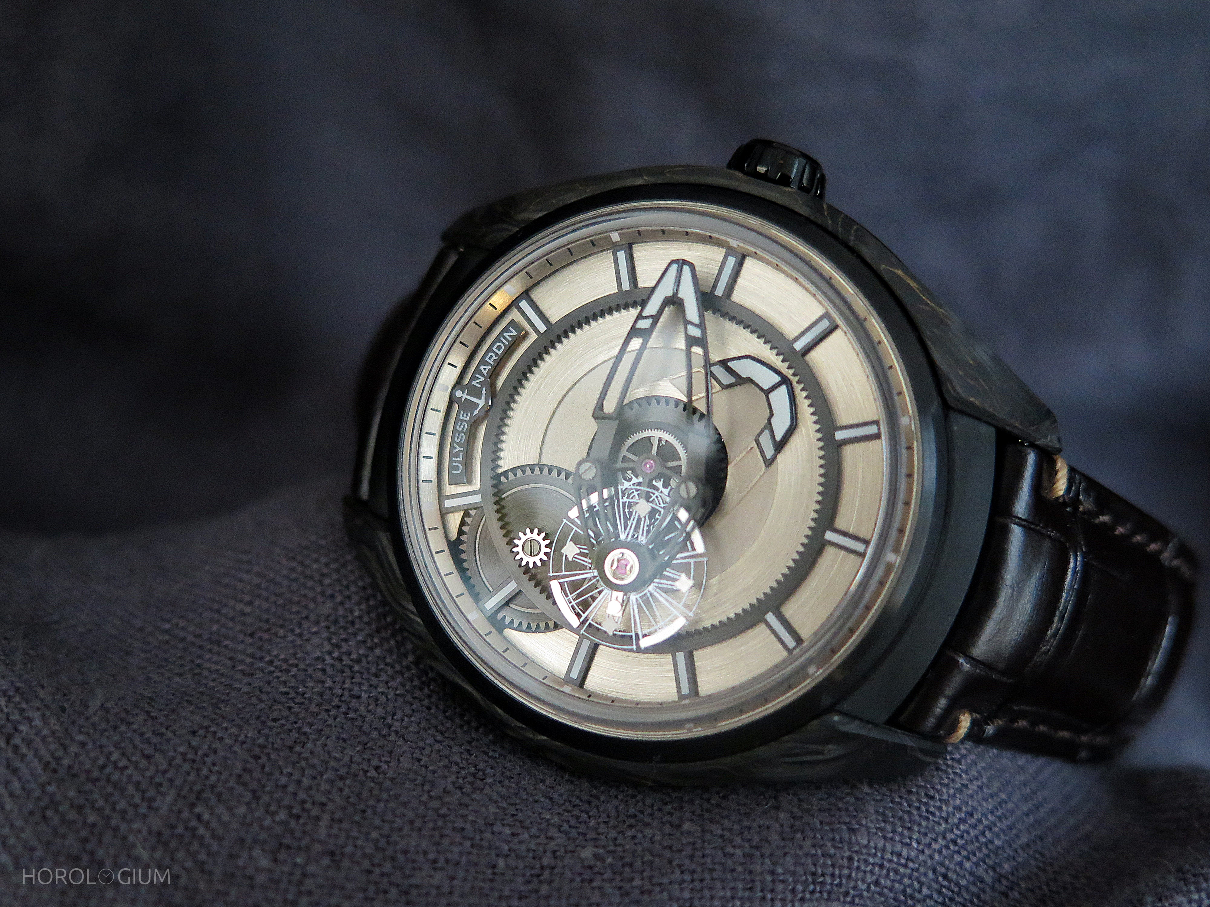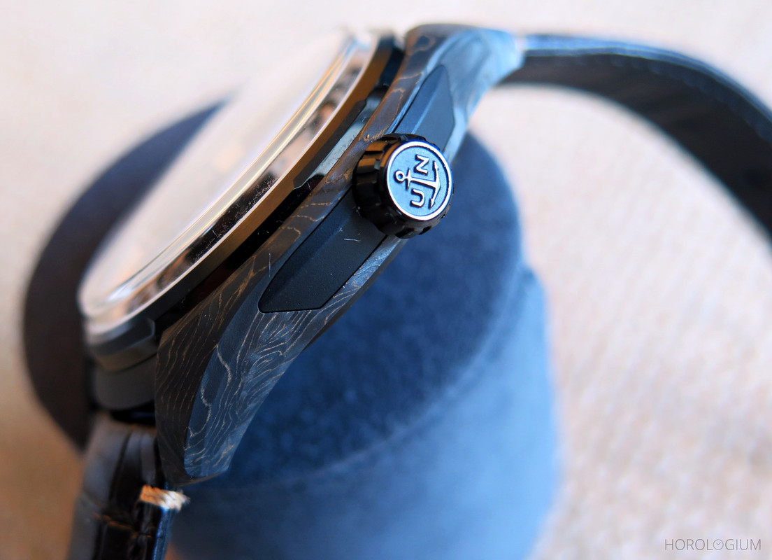 Carbonium® is a composite material made from gold particles and 7μm aeronautical grade carbon fibres. The latter are twice as light as aluminum, and 95% sourced from carbon by-products used in the aeronautical production industry. As well as being light, it is also tough (and thus has good scratch resistance) and has an interesting texture visually. The process development used to turn the carbon by-products into this composite is, according to Ulysse Nardin, based on three patents led by Lavoisier Composites.