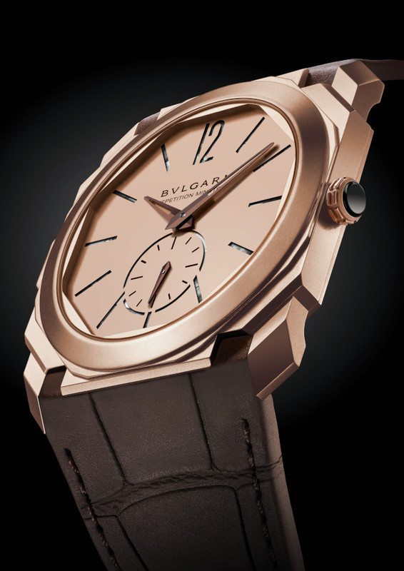 The key piece is the Octo Finissimo Minute Repeater, making its first appearance in a precious metal – rose gold, after earlier versions in titanium and carbon (both a mere 6.85mm thick). The case size is 40mm and water resistance, 30m. The metal treatment gives the rose gold an interesting texture, and the dial has a cut out design like its predecessors. It uses the same ultra thin (3.12mm) manual-wind Calibre BVL 362 minute repeater movement which has a 42 hour power reserve, but because of the case material, this new sandblasted rose gold minute repeater is a fraction thicker, at 6.90mm.