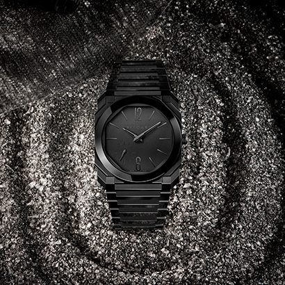 Coming on an integrated satin-polished steel bracelet with a folding clasp, the Octo Finissimo Satin-Polished Steel has a polished steel screw-down crown set with ceramic inlay, black lacquered dial, and faceted rhodium-plated hands.
