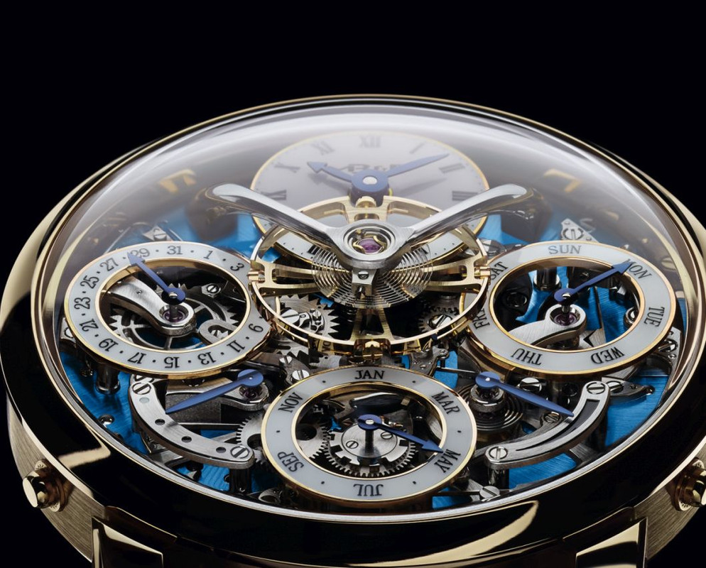 The 18k yellow gold case measures 44mm x 17.5mm. It has double AR-coated sapphire crystals and it is water resistant to 30m.