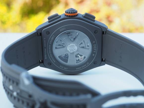A reinterpretation of the El Primero 1/100th of a second high frequency chronograph, the closed matte grey dial is in keeping with the case’s material. Also in keeping with the colour scheme are anthracite hands that are coated with Super-LumiNova, as are the hour markers. At the top of the dial is something unexpected (and interesting) – a linear power reserve display with red and white colouring that is a nod to the Defender’s vintage dashboard fuel gauge clocks.