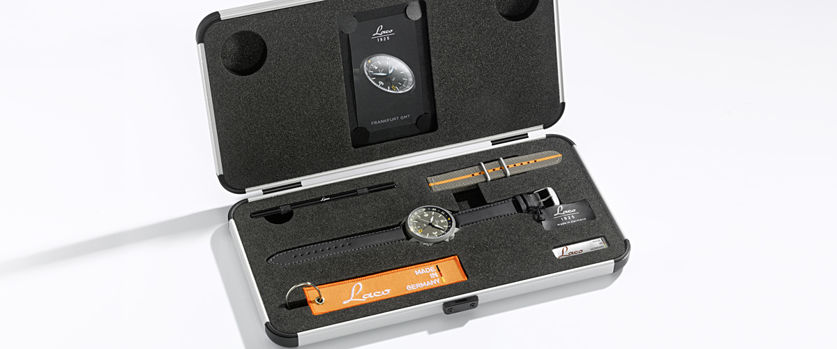 The Frankfurt GMT Schwarz and Frankfurt GMT Grau are available from authorised dealers or directly from Laco for EUR 1,650 (including tax).