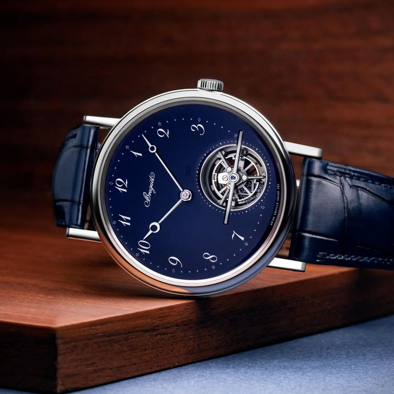 Debuting in 2013, this reference, a svelte automatic tourbillon, introduced its first grand feu enamel dial, in white, in 2018. Now, Breguet add a deep dark blue enamel dial to the mix.