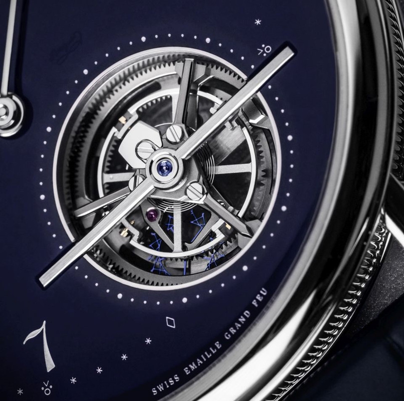 The dial, like its predecessor, is the result of the application of blue shades of enamel in multiple thin layers to a gold dial, firing it in a furnace at 800º C, and hand-polishing it to its desired colour and finishing.