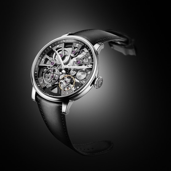 The Nebula was originally launched by Arnold & Son at Baselworld 2016. Coming in a 41.5mm stainless steel case and introduced as the brand’s entry level timepiece, it highlighted their Calibre A&S 5101, a manually wound movement beating at 21,600VPH with a 90-hour power reserve courtesy of the two mainspring barrels. Decoration-wise it featured NAC-treated bridges and a black ADLC-treated mainplate (for the stainless steel model in this post) or palladium-coated bridges and NAC-treated mainplate (for the red gold model) with chamfered bridges with polished edges and brushed surfaces, chamfered wheels with polished edges, gold chatons, and screws with bevelled and mirror-polished head.
