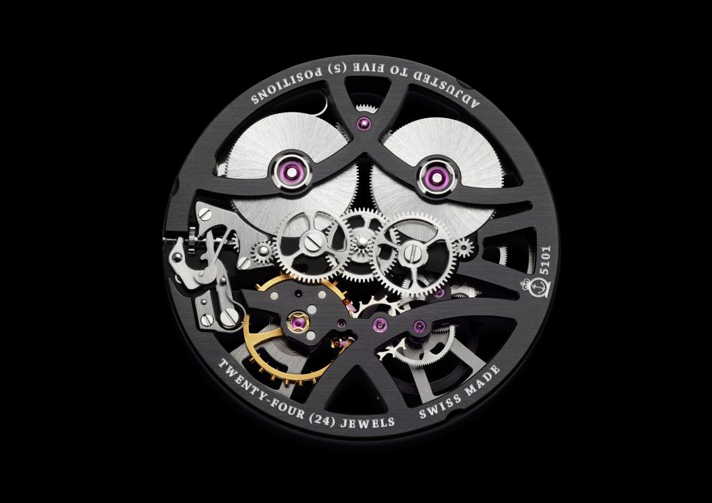 The dial is characteristic by seven bridges attached to the perimeter of the mainplate. With all bridges and plates open-worked, the ‘dial’ such as it is, is reduced to a black lacquered chapter ring with seven bridges attached to the perimeter of the main plate. The bridges are vertically brushed finish and feature highly polished bevels. The main plate and bridges are all chamfered, polished and treated with black ADLC. At 7 o’clock is a small-seconds sub-dial, with its symmetrical ‘partner’ being the balance at 4 o’clock.
