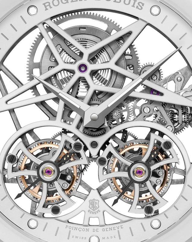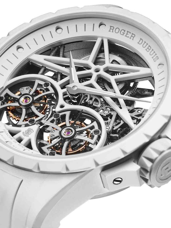 The 45mm-sized mono block case has a water resistance of 30m and is made from Mineral Composite Fiber (MCF), a new material developed for Roger Dubuis. A stark white with a satin-like finish, it is 99.95% silica. The material is made by layering thin sheets of the quartz and combining it with an epoxy resin to which a white colouring agent is added during a process called Sheet Molding Composite (SMC), resulting a white colour that will not fade/ change over time. After this, the raw shape of the case is milled. For the new Excalibur Twofold, this new composite material has also been applied to the top surfaces of the double tourbillon and star bridges of the skeletonised movement.