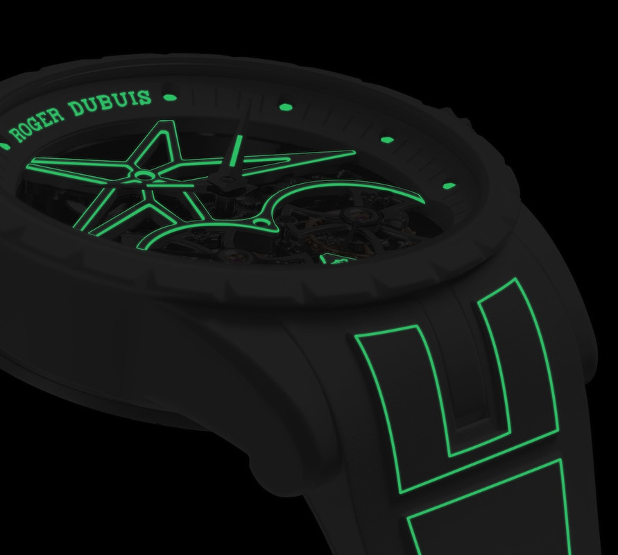 Materially and luminescence-wise (especially the strap), this is a an intriguing new watch, and it will be interesting to see how Roger Dubuis uses MCF in the future.