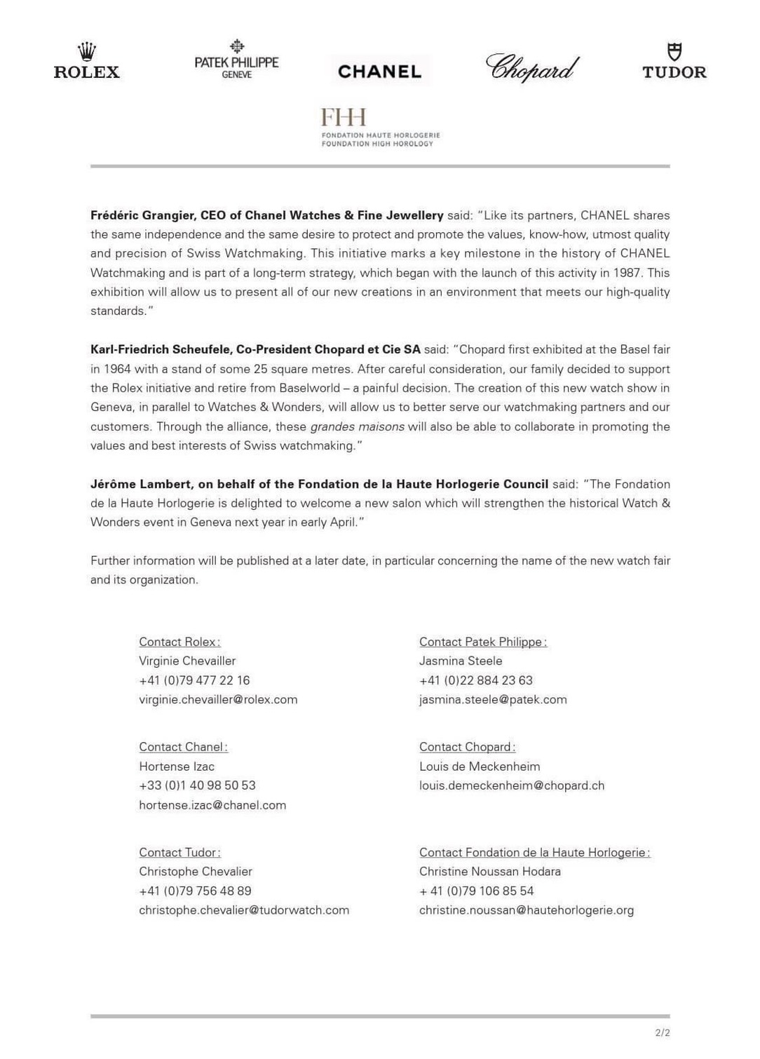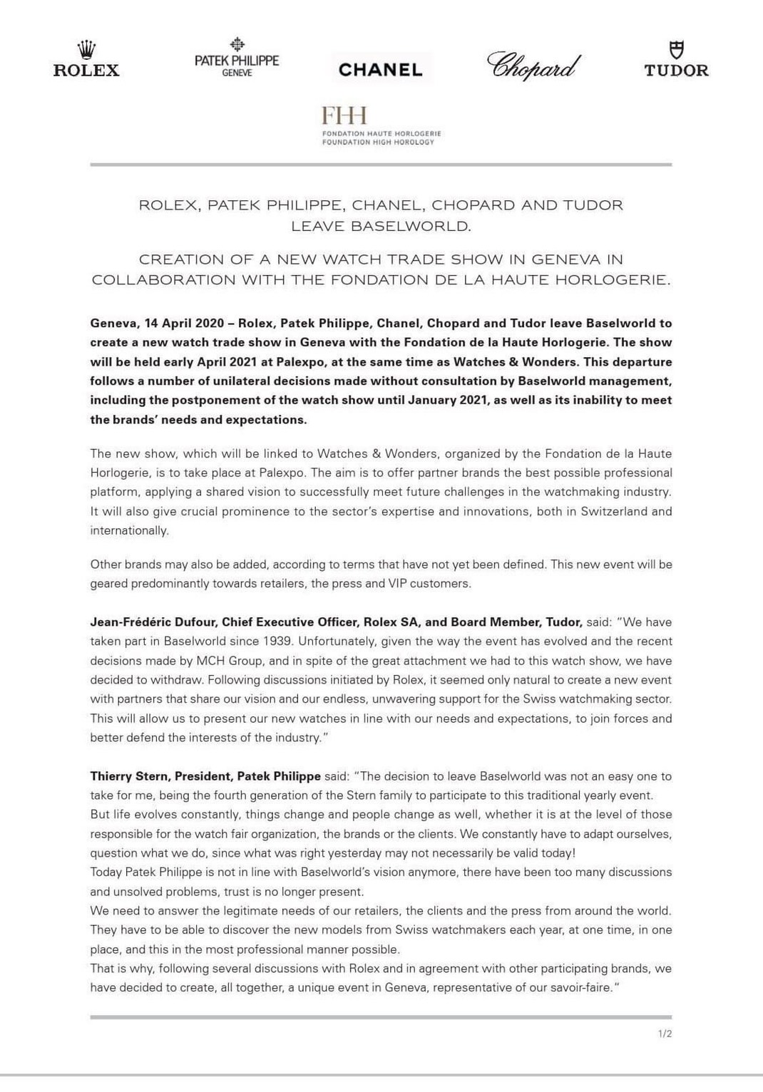 Some of Baselworld’s major exhibitors, in the form of Rolex, Patek Philippe, Chanel, Chopard and Tudor, have made the decision not just to leave Baselworld, but to hold a new show in conjunction with the FHH and the new Watches & Wonders Geneva. The official press release is below.