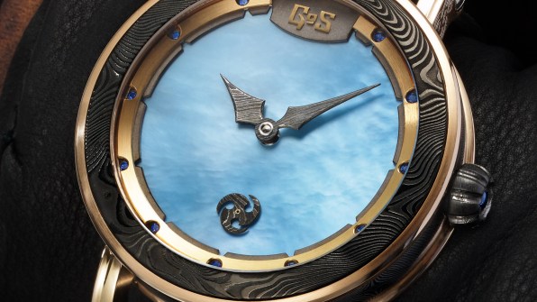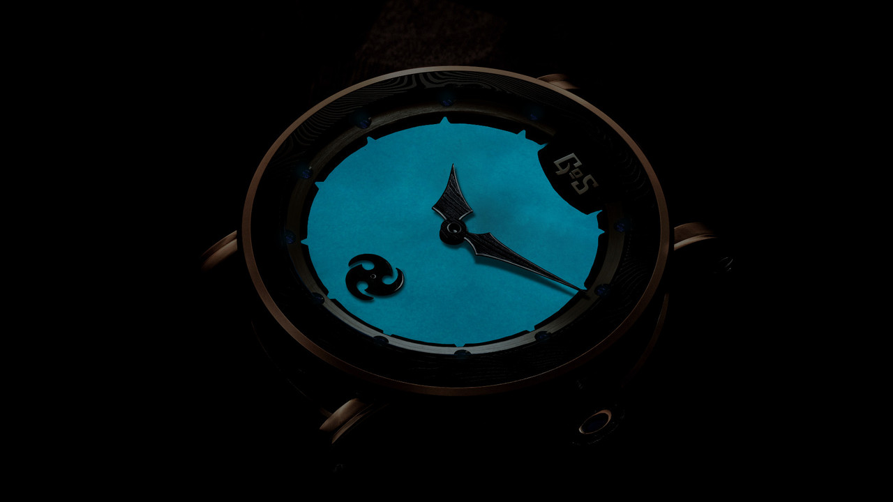 GoS is known for their use of Johan Gustafsson’s Damascus steel, and so it is with the Norse mythology-inspired Skadi, which combines black Damascus steel with red gold, and features an ice blue luminous mother-of-pearl (MOP) dial developed and made by Patrik Sjögren that debuted in the Sarek Glacier. The dial consists of three layers – a brass base, a middle layer of Super-LumiNova, and the top MOP layer which is both coloured by and back-lit through, the middle layer. Why MOP? Well for a similar reason to that of the Sarek Glacier – Skadi (Skaði) is a Norse goddess associated with winter (and the mountains). She is often depicted skiing and with a bow and arrow, both of which she utilises for hunt and battle. This watch named for her has a water resistance of 5ATM, so it can endure a bit of snow.
